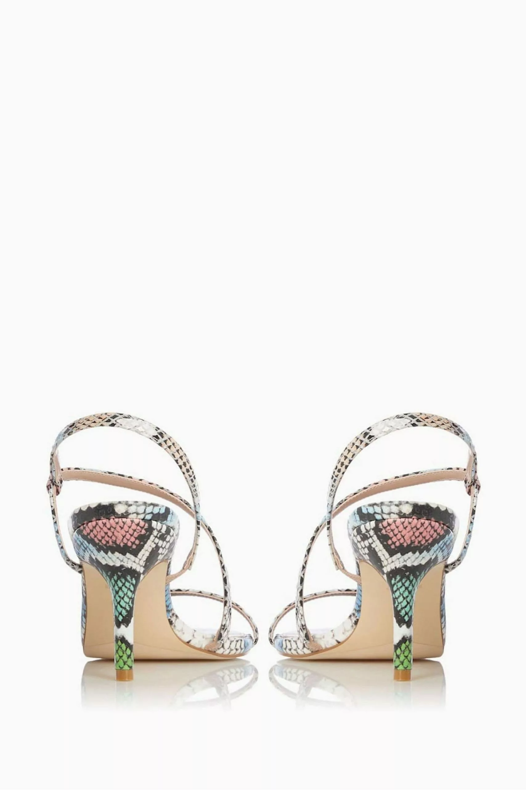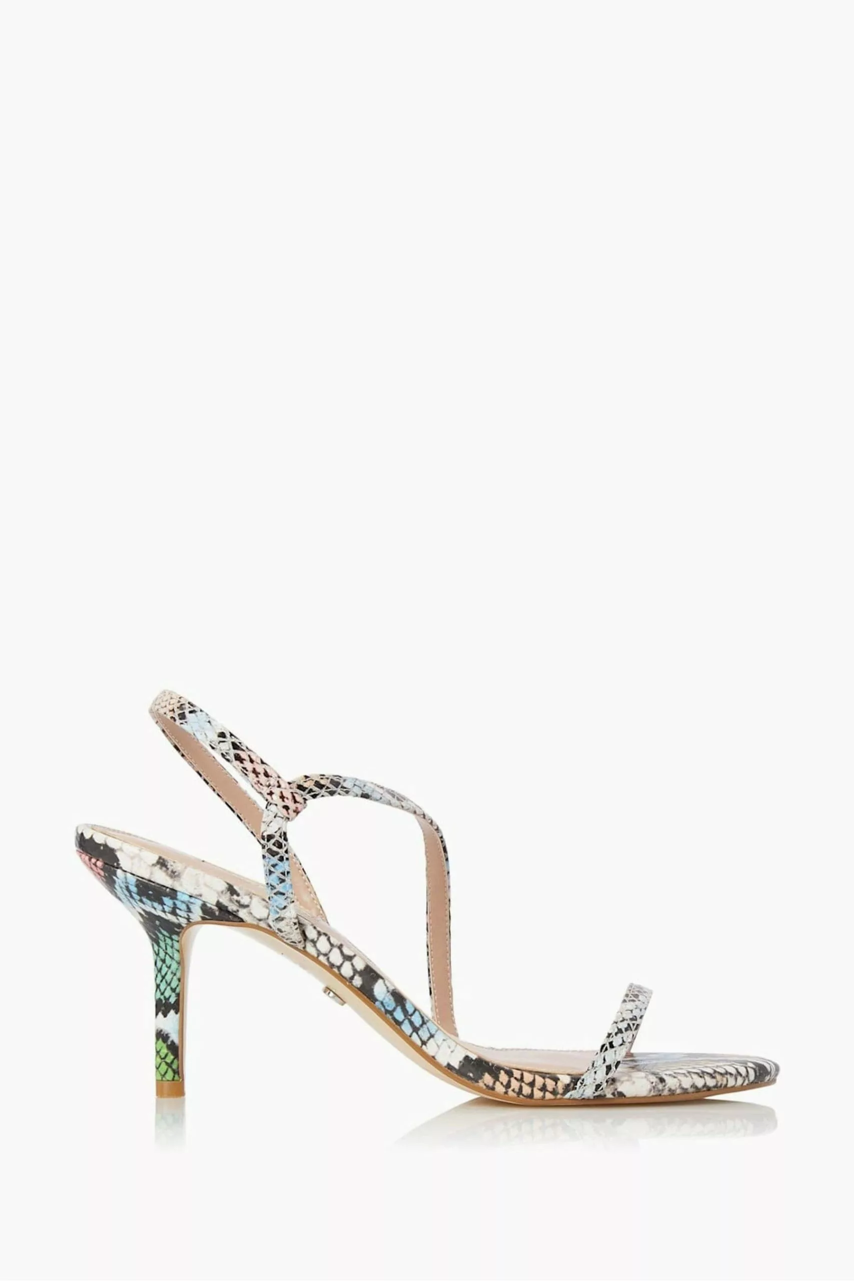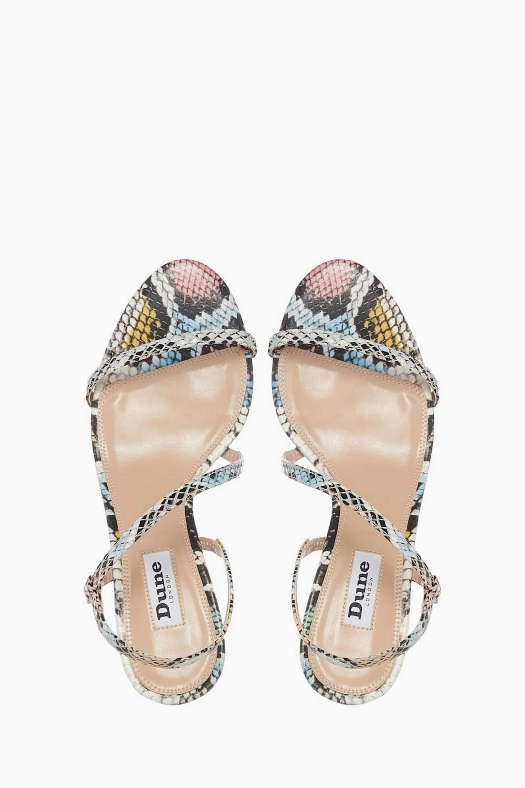 This sandal by Dune London is a simple yet stylish evening option. Showcasing a feminine asymmetric strap with a slingback design. It features an open sandal toe and rests on a mid stiletto heel.