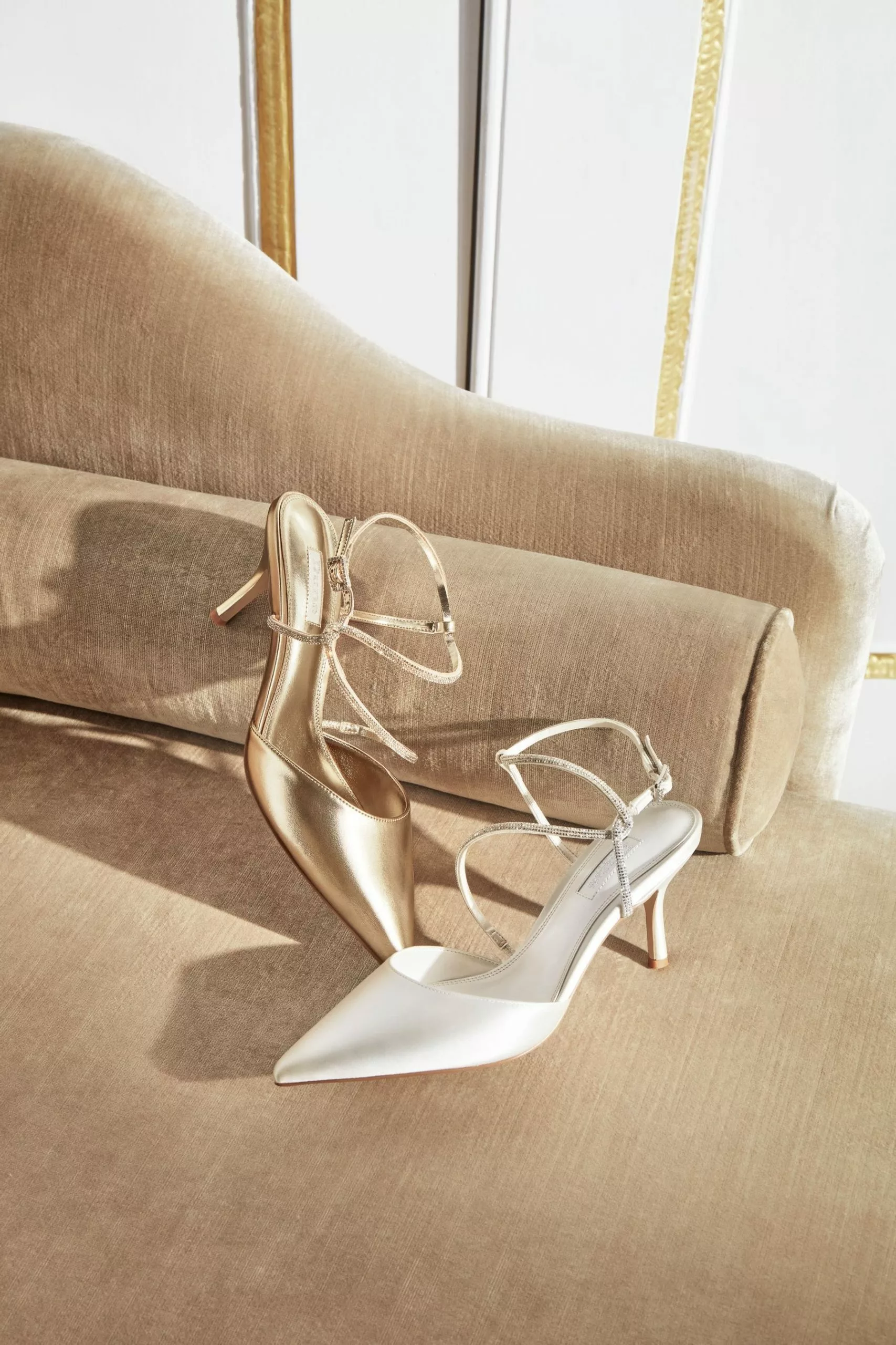 Combining comfort and opulence our satin Clarrise courts have been expertly crafted with memory foam lining to take you seamlessly from ceremony to first dance and beyond. Designed exclusively in-house these pointed mid-heel shoes feature diamante-embellished asymmetric strap detailing and fasten with a diamante fastening. For us, it’s a focus on the intricate details like the delicate blue stone that has been set into the sole of each style that sets The Wedding collection apart.