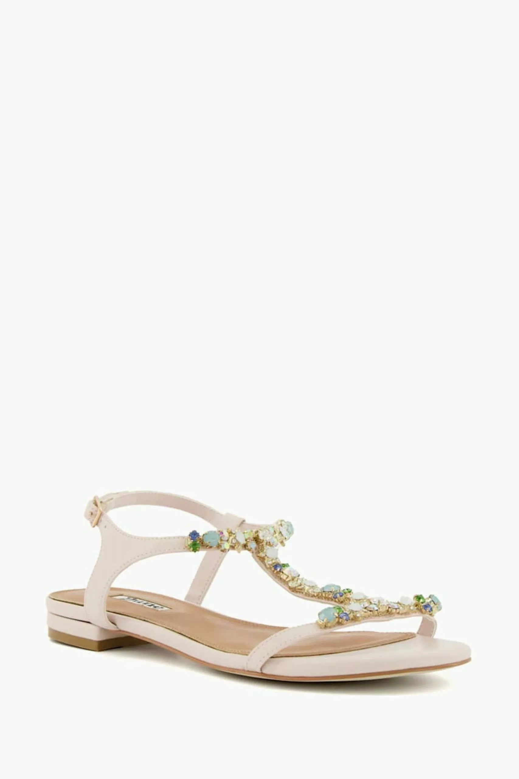 Layered with a jewel-embellished upper Nissa is a glimmering elevation of the classic flat sandal. Crafted with the finest materials this standout T-bar silhouette will effortlessly take centre stage in your warm-weather wardrobe.