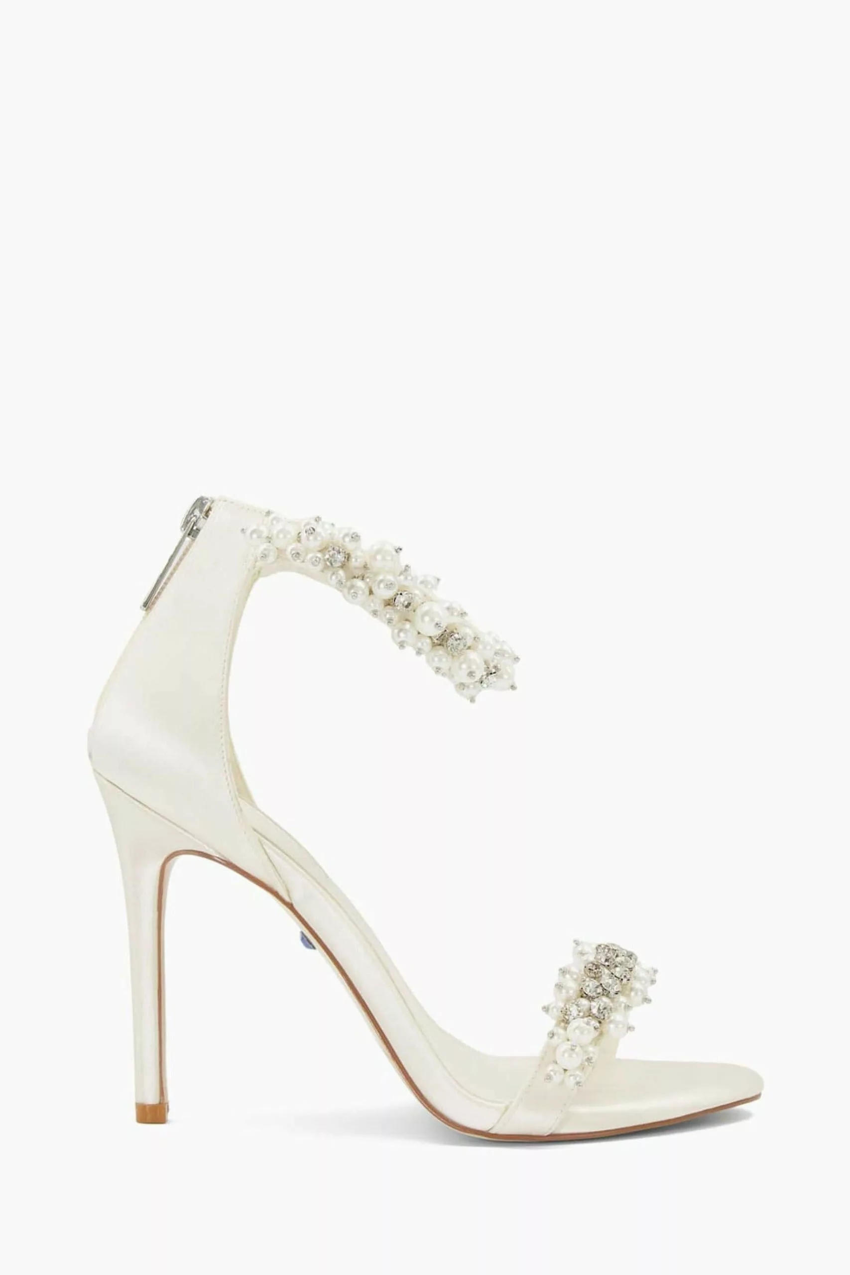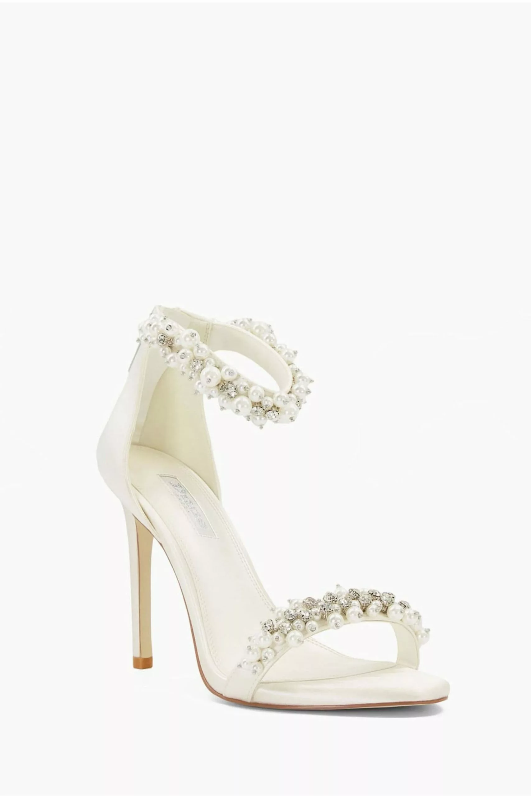 Calling all brides-to-be: Say yes to our wide-fit Marriage bridal sandals. Set on a sleek high-stiletto heel they’re crafted from sumptuous satin but what truly makes this special is how we ve encrusted the straps with faux pearls and beads to further elevate the look. The hardback is fastened with a secure zip.
