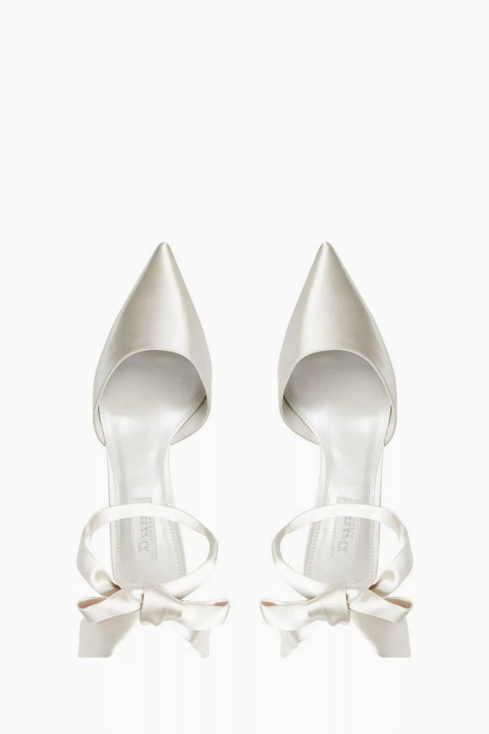 Effortless elegance for the modern bride. The luxurious satin tie, wraps elegantly around the ankle. Look underneath these sleek satin shoes for a little something blue.