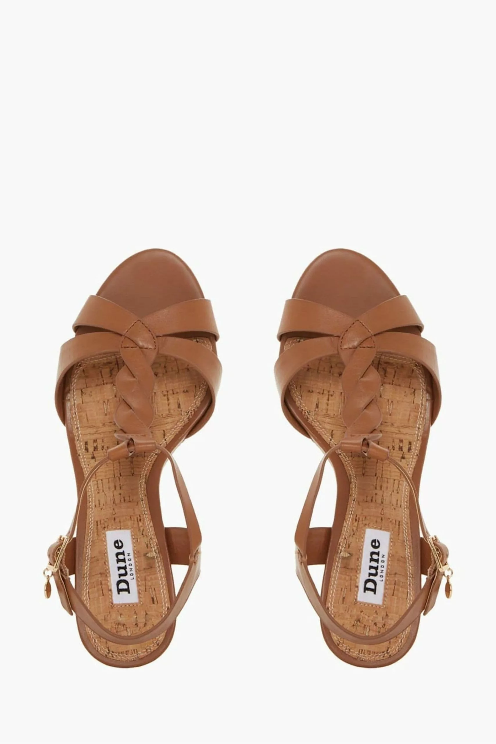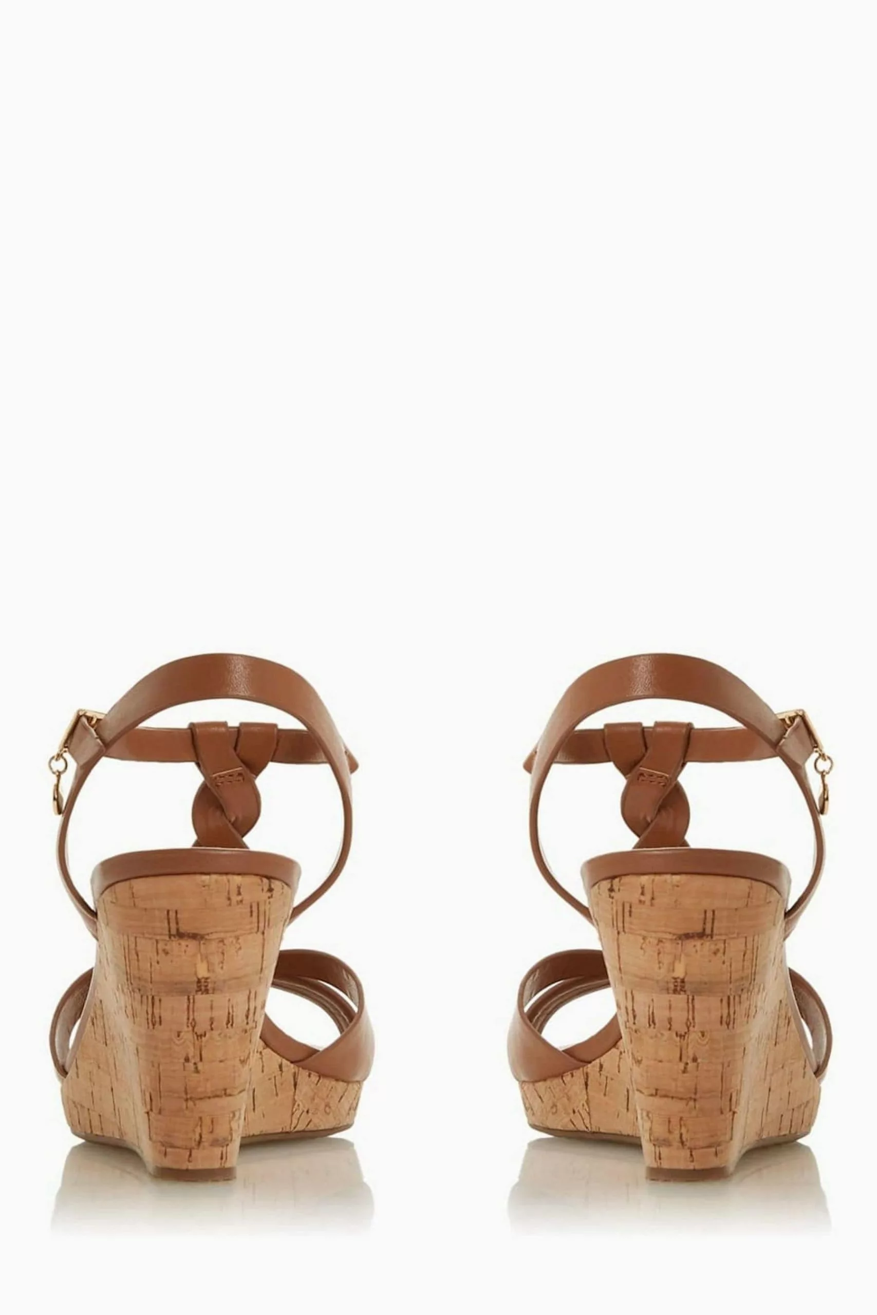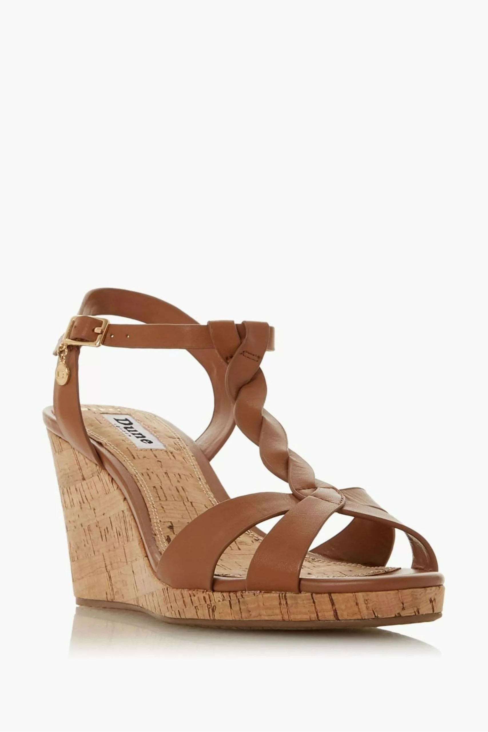 Dune London Koala Leather Plait T-Bar Strap Cork Wedge Heeled Sandals