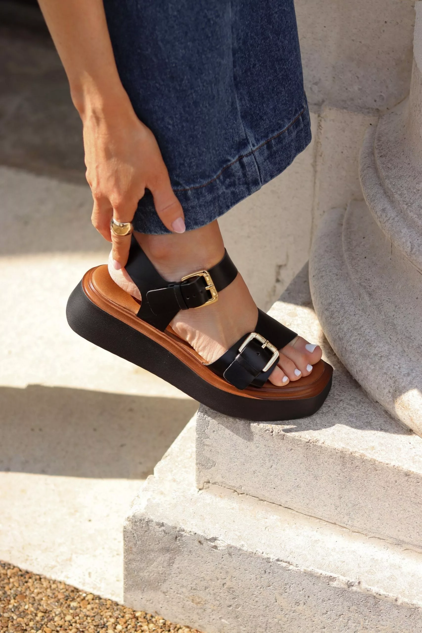Refresh warm-weather ensembles with minimal sandal Loells. Crafted from the finest material the upper of this square-toed silhouette culminates in two wide straps each enhanced with large buckles. Set on a flatform sole that rises to a wearable 4cm height this versatile sandal pairs equally well with everything from denim to sundresses and is finished with a lined footbed that promises all-day comfort.