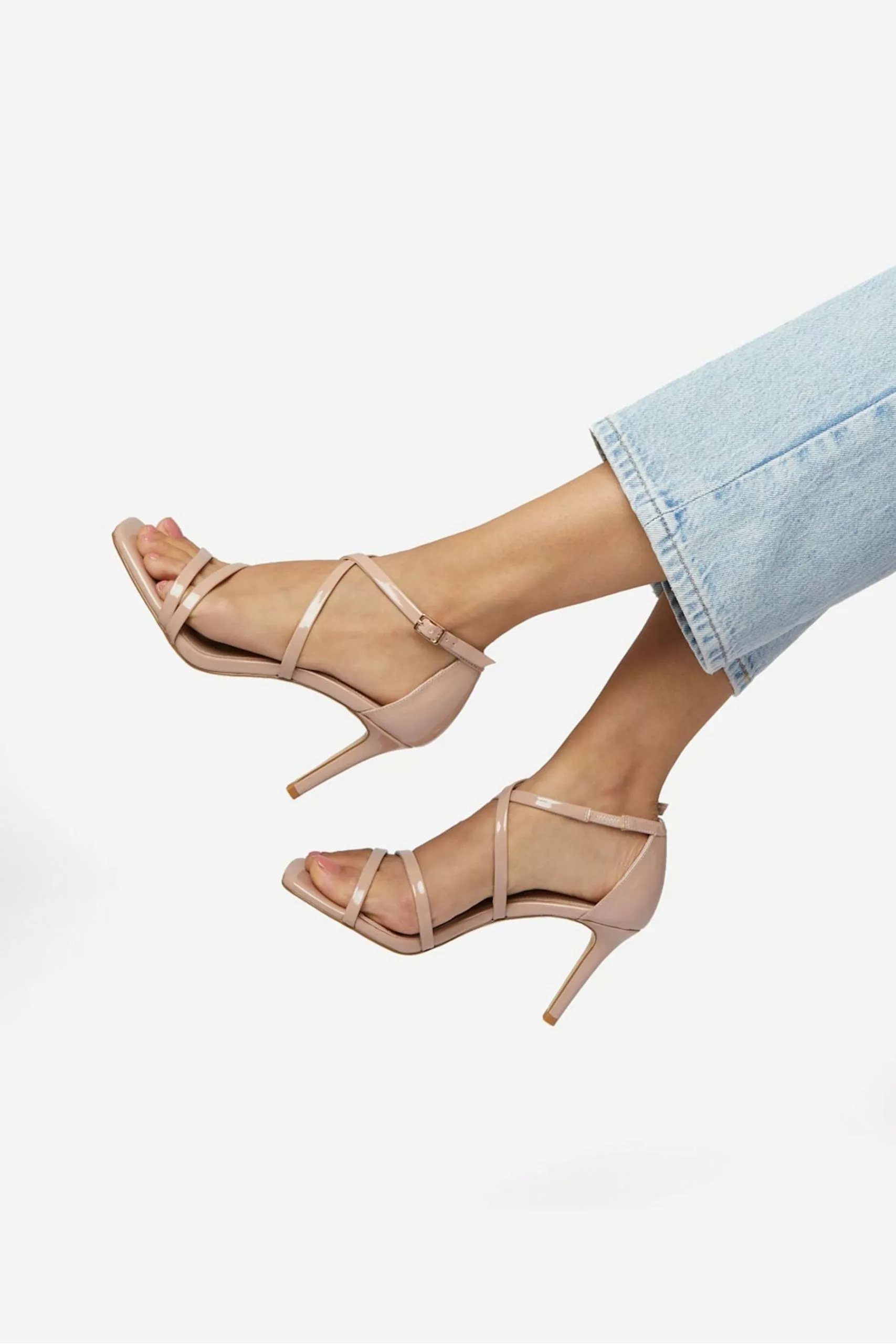 Make a subtle style statement in their elegant square toe high heel design. Resting on a stiletto heel and secured in place with an adjustable ankle strap these wide fit open toe sandals will be a versatile addition to your heel repertoire.