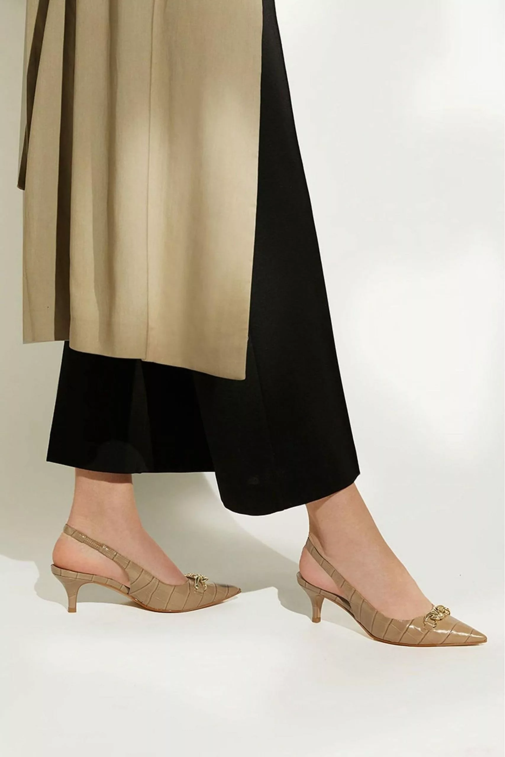 A classic slingback court elevated standout style Current is the ideal way to step into any occasion all year long. Crafted with the finest materials in an array of colourways and finishes this style takes the timeless point-toed silhouette and subtly updates it for the new season with a metal-chain trim. Set on a kitten heel for ease of wear the elasticated finish ensures the ideal fit.
