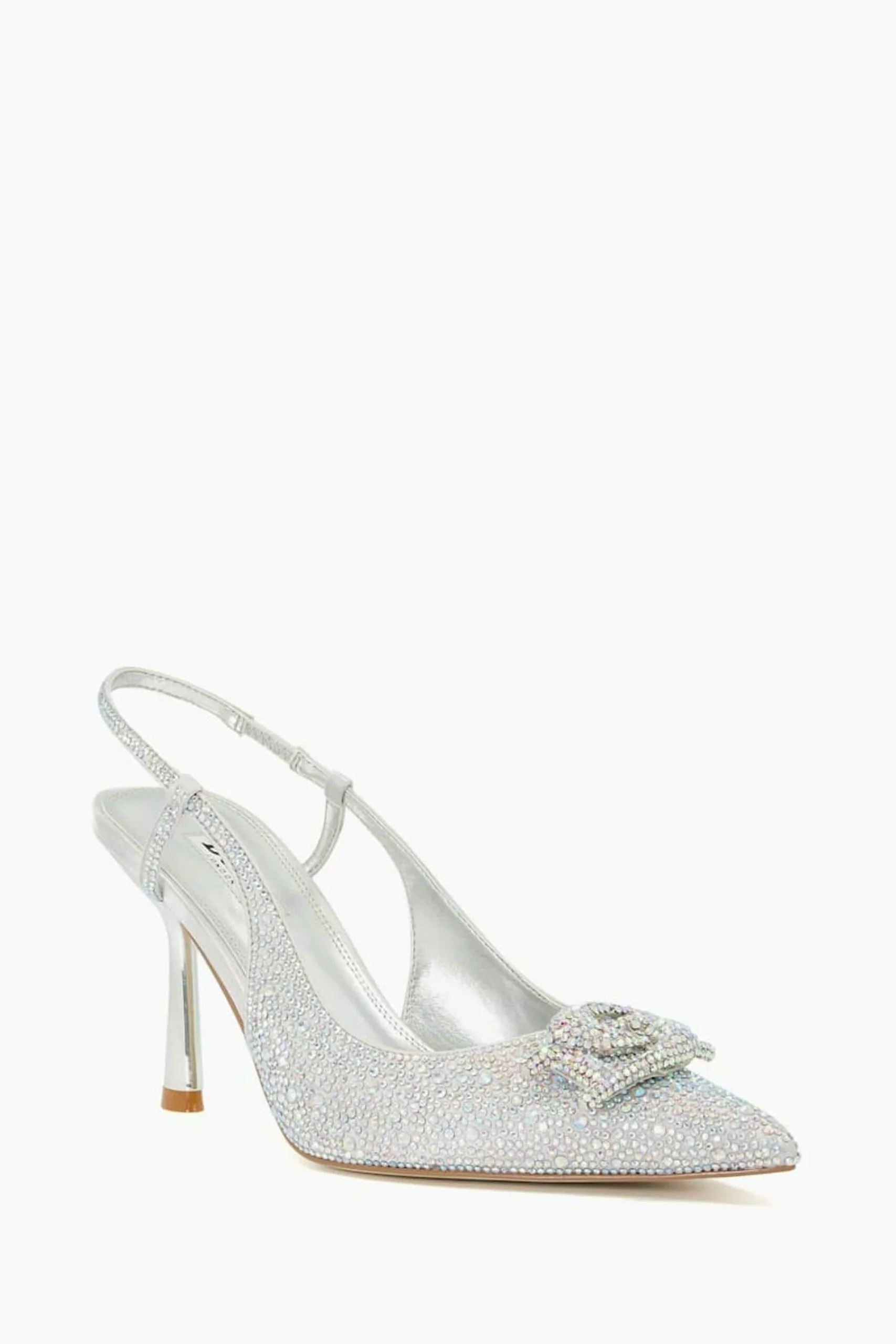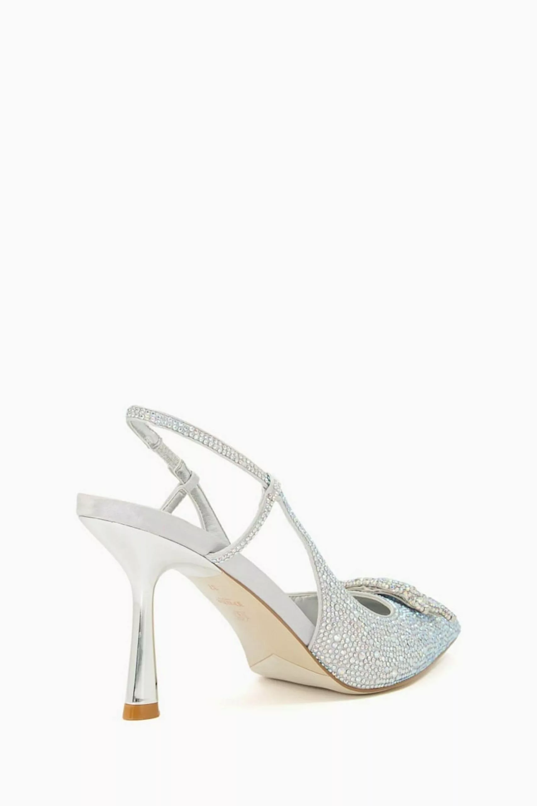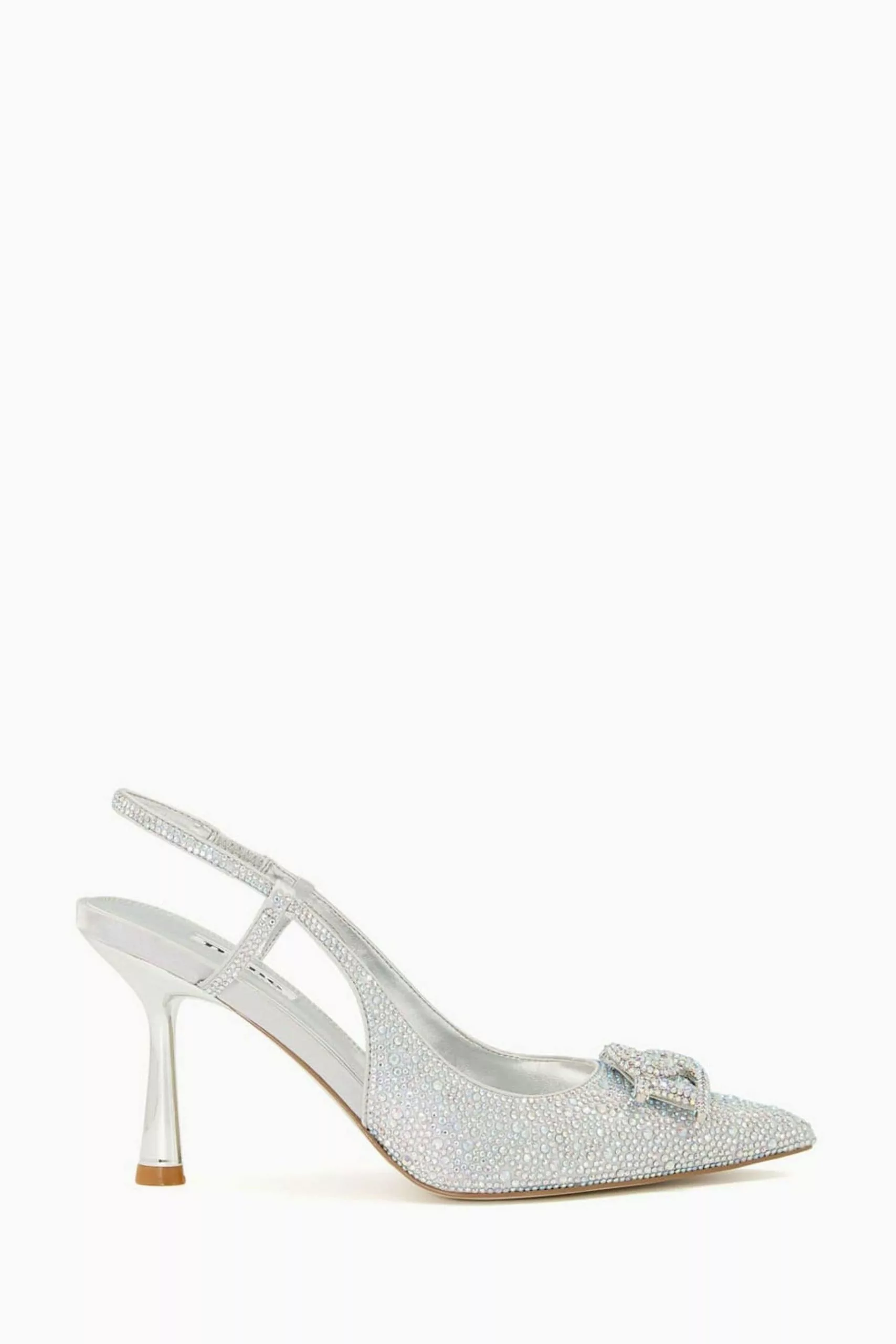 Perfect for event season and special occasions take a step towards glamour with our statement sling-back Create heels. Much like our matching Beamed clutch bag, this standout style is covered with hot stone embellishments throughout and detailed with an elongated pointed toe and retro-inspired flared heel. Our bespoke interlocking DD logo further sets these heels apart.