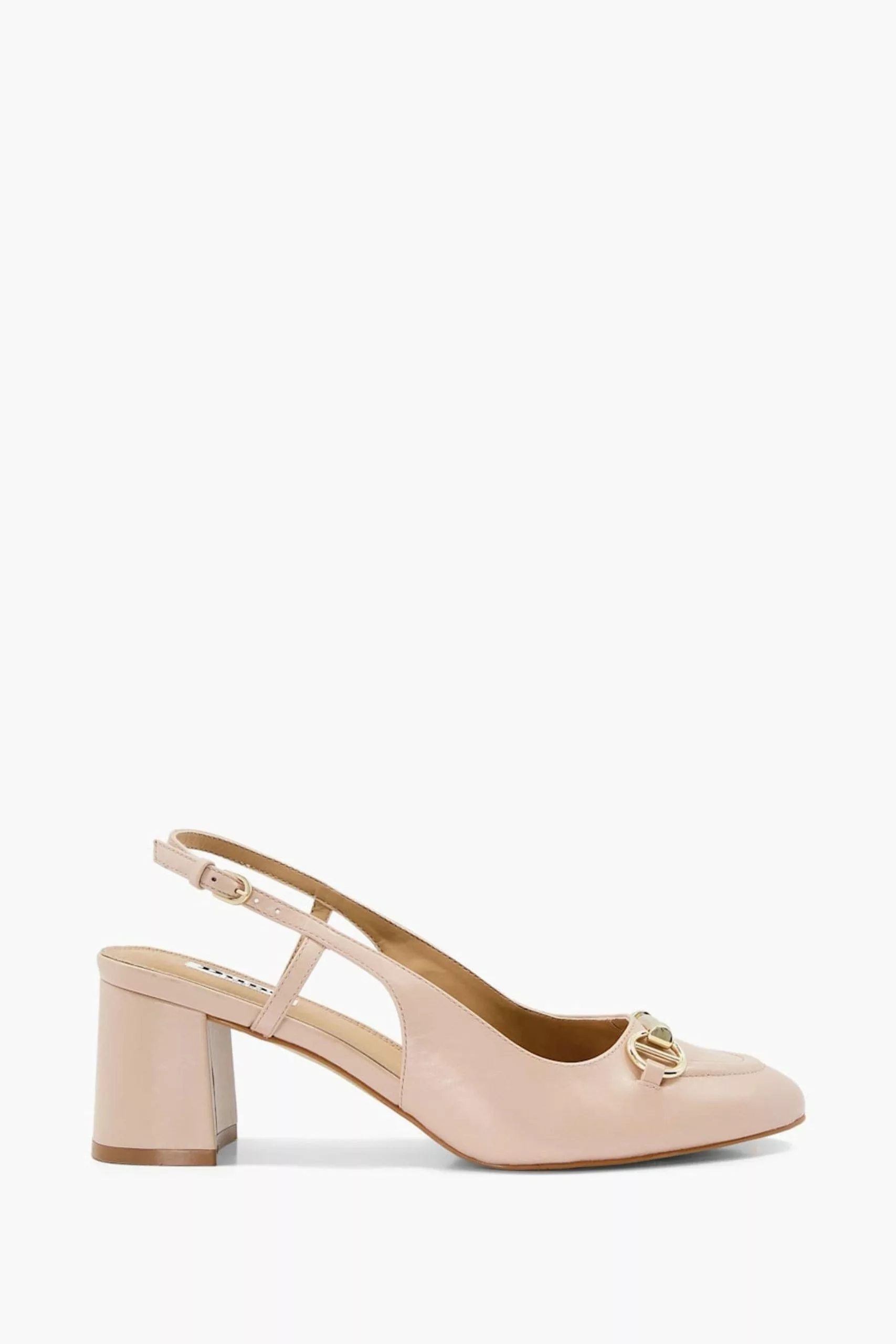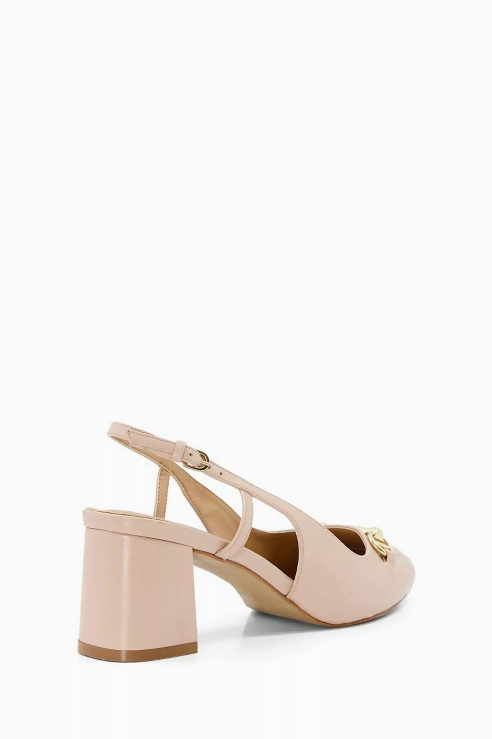 A sophisticated pair of sling back court shoes with classic snaffle-detail design. Set on a wearable mid block heel the ladylike, feminine silhouette is punctuated with gold hardware and an adjustable buckle on the ankle strap ensuring a perfect fit.